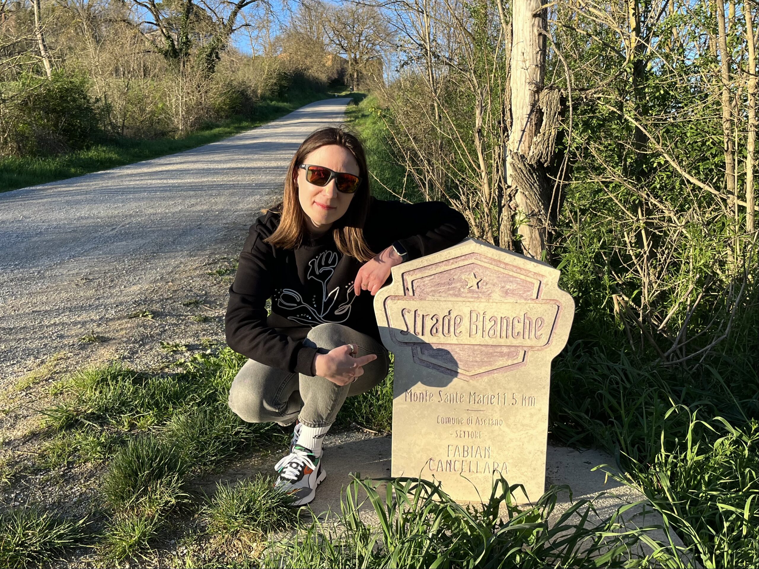 Na miniaturce powyżej widzicie mnie pod kamieniem Fabiana Cancellary, trzykrotnego zwycięzcy Strade Bianche. Tego samego dnia, którego odwiedziłam Sienę, postanowiłam odszukać ten kamień i zawitać na szutrowy sektor Monte Sante Marie, który został nazwany imieniem byłego szwajcarskiego kolarza. Istnieje bowiem taka tradycja, aby ochrzcić jakiś sektor imieniem zawodnika, który wygrał wyścig trzykrotnie. Na razie ta sztuka udała się tylko Cancellarze, ale kto wie, czy w przyszłości nie dołączy do niego chociażby Tadej Pogačar czy Michał Kwiatkowski.